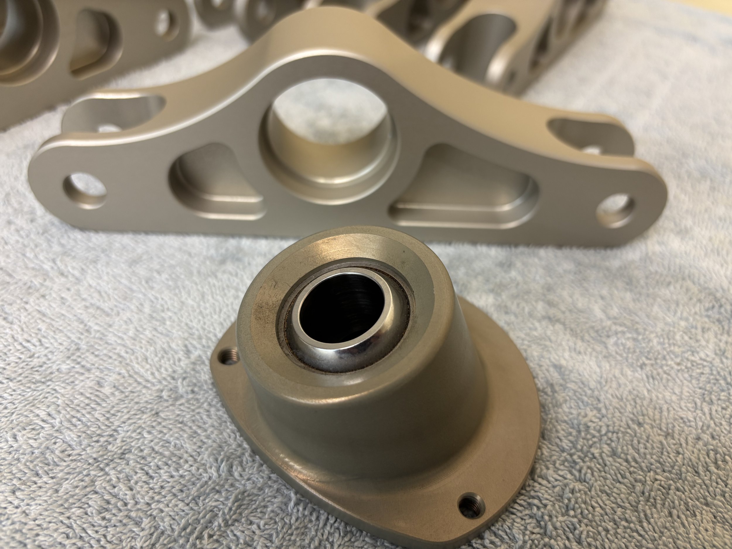 Shown: Type III anodised 6061T6 suspension ball joint in foreground - note the darker olive shade, as evidence of the thicker anodic layer - with a Type II anodised 6061T6 support arm in the background (note the lighter shade).